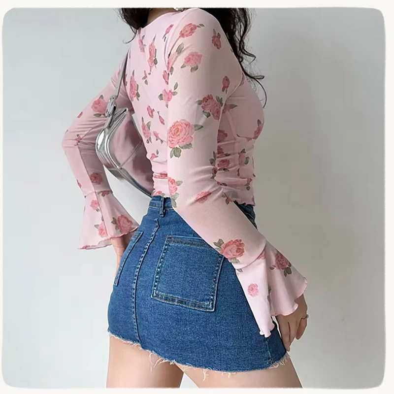 Home Women Tops & Blouses HELIAR Women Floral Printed Sweet Holiday T-shirts Flare Sleeve Lace Up Chiffon Office Blouse Mesh Beach Tees Top Spring Summer